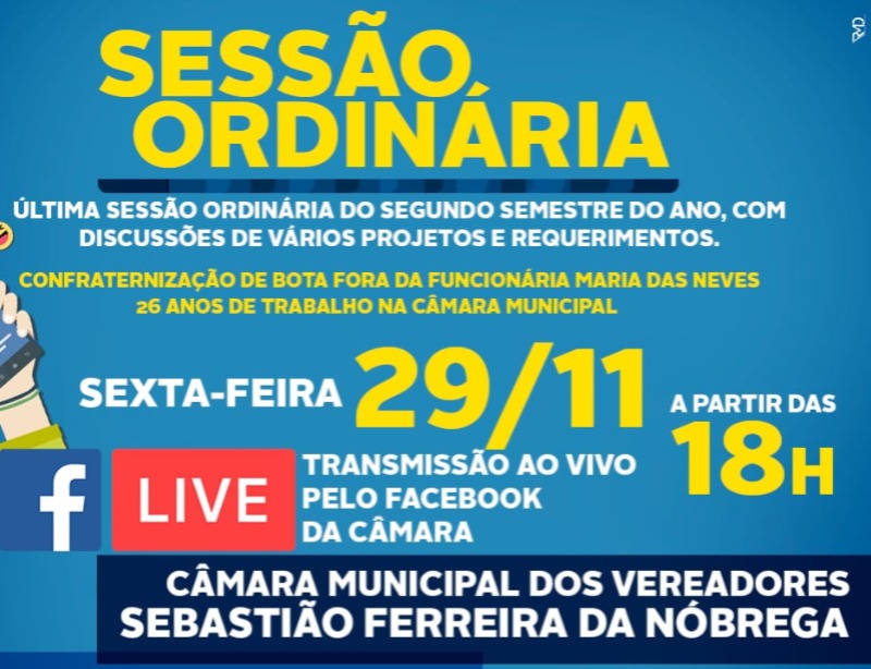 A Câmara Municipal de São José de Espinharas realiza nesta sexta-feira (29) a última sessão ordinária do período legislativo de 2019.A sessão inicia às 18h, segundo o presidente da Câmara Municipal, vereador Carlinhos Vida. "Convidamos toda população para acompanhar o trabalho em plenário e depois também participar de uma confraternização que será feita em encerramento das atividades este ano", disse.