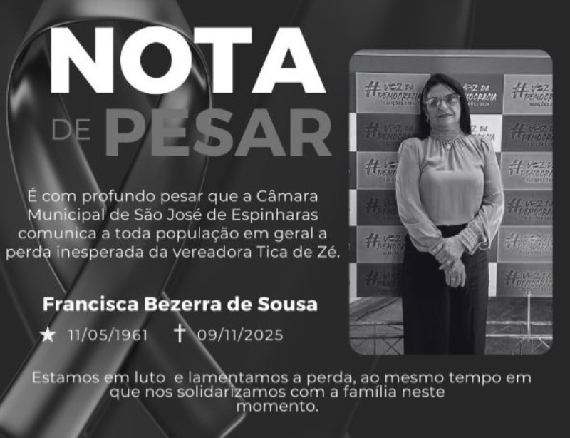 É com imensa tristeza que a Câmara de São José de Espinharas recebe a notícia do falecimento de Francisca Bezerra de Sousa, carinhosamente conhecida como Tica de Zé, ocorrido neste 09 de novembro de 2025.