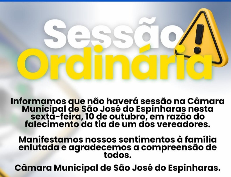 A câmara de São José de Espinharas comunica a toda população que a sessão ordinária prevista para ser realizada nesta sexta-feira, dia 10 de Outubro, foi cancelada, devido o falecimento da tia de um dos vereadores da Casa.